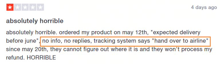By analyzing Trustpilotās negative reviews about AliExpress, I found that 80% of the complaints most frequently mentioned delivery delays, lack of tracking, products not meeting expectations, and unpleasant dispute processes. These are 4 main reasons why customers feel insecure.