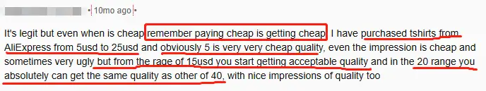 But there is another situation: you think the item is inferior or fake just as it fails to meet your high expectations. Especially with branded items on AliExpress, like the ālatestā pair of Nike shoes for $30 with free shipping, itās clear they wonāt be as good as the original ones. As long as the quality aligns with a $30 value, itās acceptable. Here are 2 AliExpress users’ comments.